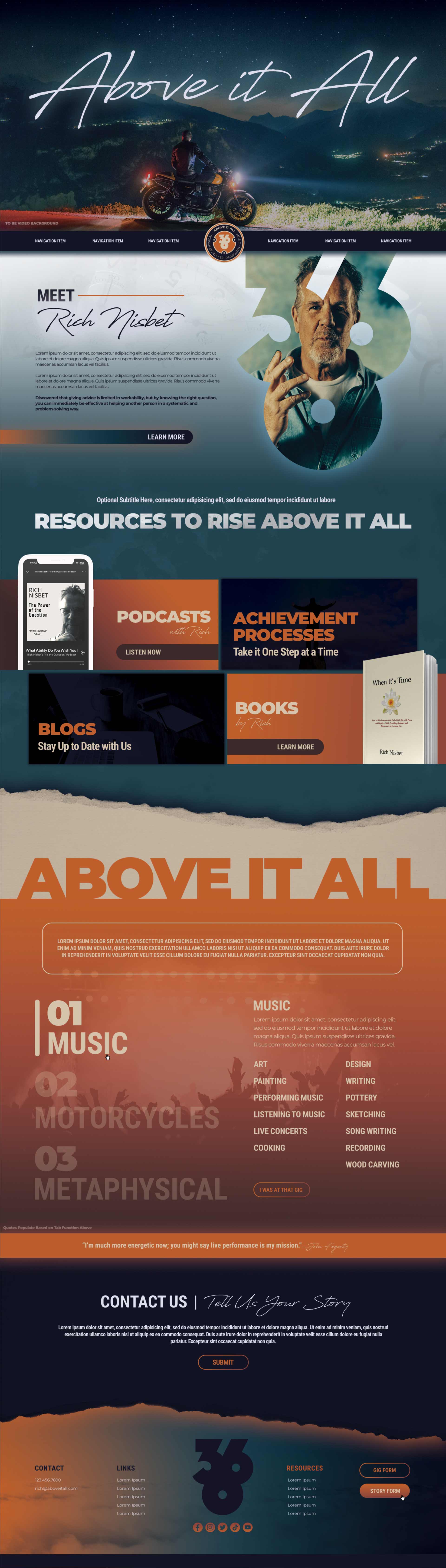 Rich Nisbet is more than just a storyteller - he’s a story collector. Honing in on music, spiritual counseling, and enriching life experiences, his website, Above it All, invites people to learn about his methods as well as share their own stories. Rich Nisbet needed a bold website with a lot of drive and moving parts in order to promote a forum of like-minded individuals and advertise his work. JLB created a custom website with timelines, split screens, and rotating quotes in the branded colors and fonts Rich Nisbet desired.