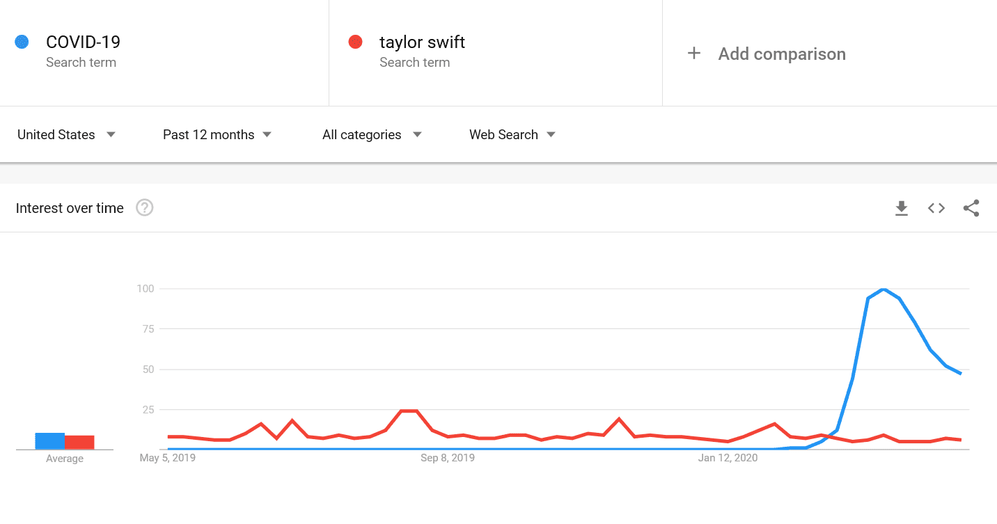 This is taken from Google Trends, which is a free tool that shows you how often specific terms are being searched. It is a graph comparing the amount of times “COVID-19” has been searched compared to how often “Taylor Swift” has been searched. Taylor Swift is generally a highly-searched term, but she barely registers when compared to COVID-19 as far as search frequency in the United States. And even though COVID-19 isn’t searched as much as it once was, it is still trending high.